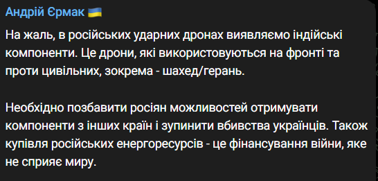 Ермак репостнул статью Hindustan Times, в которой говорится, что Украина уже официально подняла этот вопрос перед правительством Индии и Евросоюзом после находки индийских компонентов еще в прошлом году.