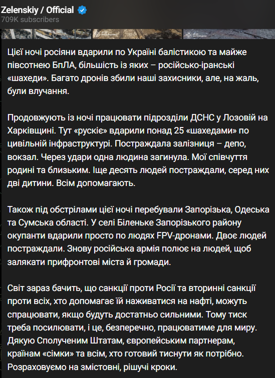 Президент Владимир Зеленский же сегодня утром, комментируя новые удары по Украине, призвал к санкциям и усилению давления в отношении покупателей российской нефти. То есть, Индии и Китая.