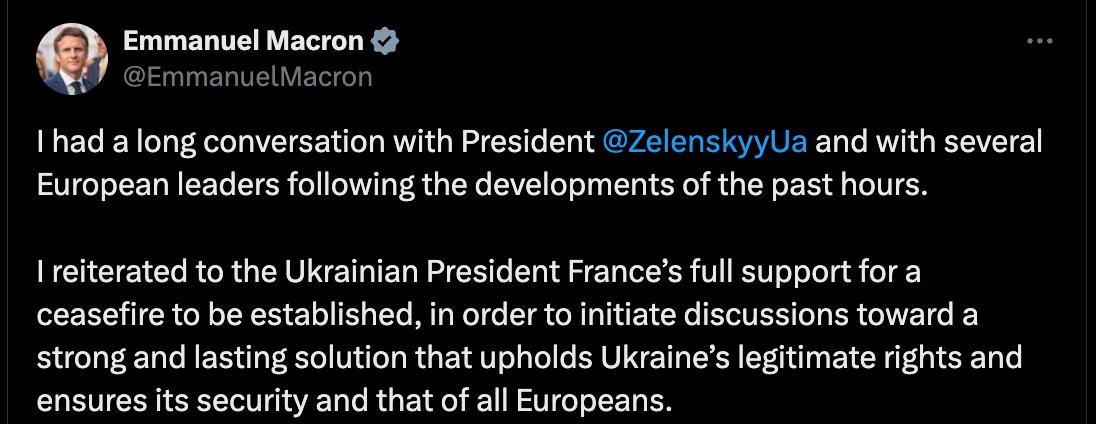 "Я подтвердил президенту Украины полную поддержку Франции установлению режима прекращения огня с целью инициирования переговоров о прочном и долгосрочном решении, которое будет защищать законные права Украины и обеспечивать ее безопасность и безопасность всех европейцев", - написал Макрон.