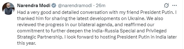 "У нас состоялся очень содержательный разговор с моим другом президентом Путиным. Я поблагодарил его за информацию о последних событиях в Украине... С нетерпением жду встречи с президентом Путиным в Индии в конце этого года", — написал Моди.