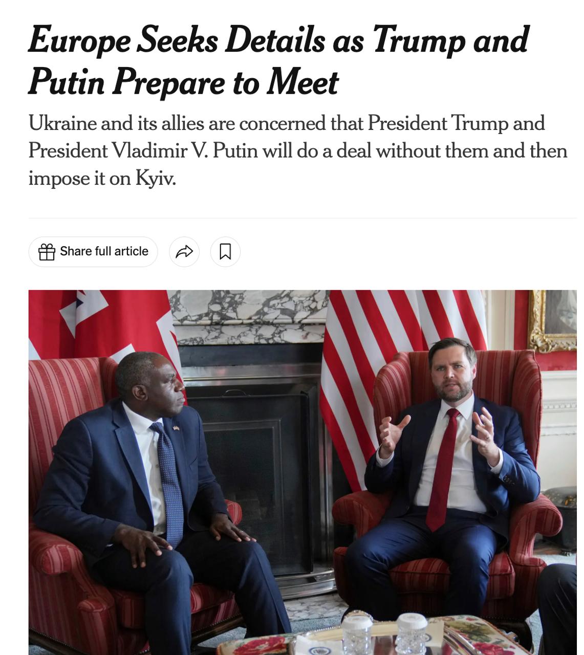 В то же время, как пишет The New York Times, анализируя сегодняшнюю встречу в Лондоне, где представители Европы ведут переговоры со Штатами накануне встречи Трампа и Путина 15 августа, европейцы обеспокоены тем, что президенты США и РФ сами придут к соглашению, которое затем попытаются навязать Украине.