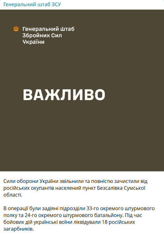 ВСУ освободили и полностью зачистили от военных РФ Бессалевку Сумской области - Генштаб