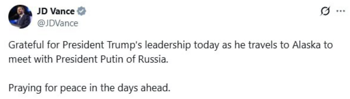 "Благодарны за лидерство президента Трампа сегодня, когда он отправляется на Аляску для встречи с президентом Путиным. Молимся о мире в ближайшие дни", – написал вице-президент США в Х.