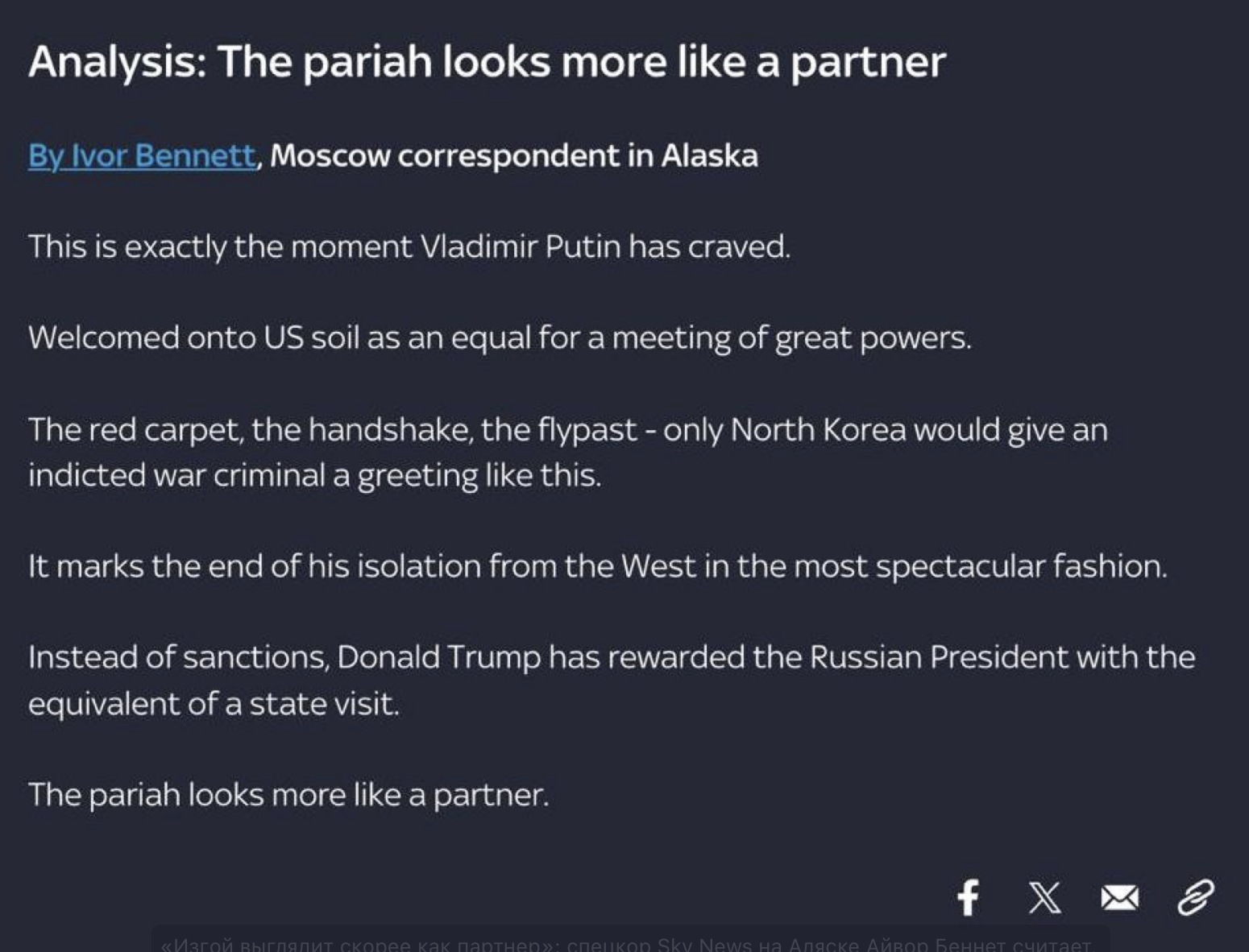 "Это именно тот момент, которого так жаждал Владимир Путин. Его приняли на американской земле как равного для встречи великих держав. Красная ковровая дорожка, рукопожатие, пролет самолетов – только Северная Корея могла бы устроить такое приветствие обвиняемому в военных преступлениях. Это знаменует конец его изоляции от Запада самым впечатляющим образом. Вместо санкций Дональд Трамп наградил российского президента чем-то, равнозначным государственному визиту", – написал Беннет.