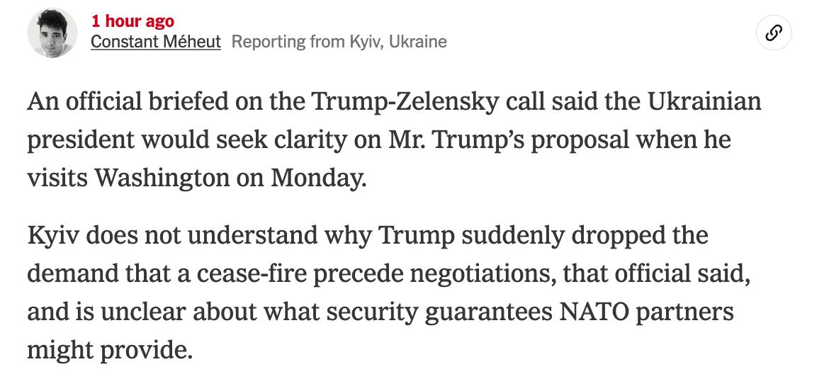 Кроме того, NYT написала, что Зеленский не понимает, почему Трамп внезапно отказался от требования к Москве прекратить огонь. Поэтому "украинский президент будет стремиться внести ясность в предложение Трампа, когда посетит Вашингтон в понедельник".