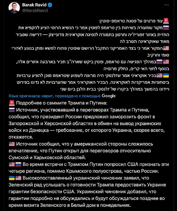 18:39 Еще одно западное СМИ пишет, что Путин во время встречи с Трампом потребовал вывода ВСУ из Донецкой области в качестве условия для прекращения войны.