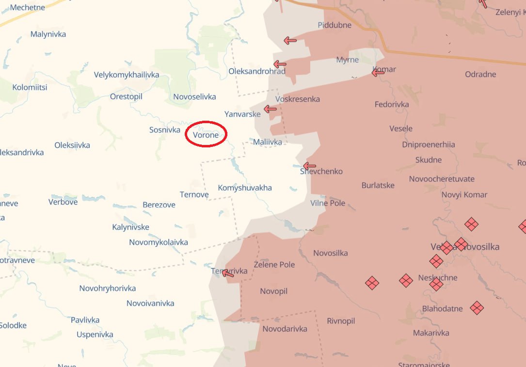 При этом на карте Deep State село находится даже не в серой зоне, а в зоне контроля ВСУ. Правда, участок линии фронта в районе Вороного – единственный, где, по данным паблика, россияне пересекли границу Днепропетровской области.