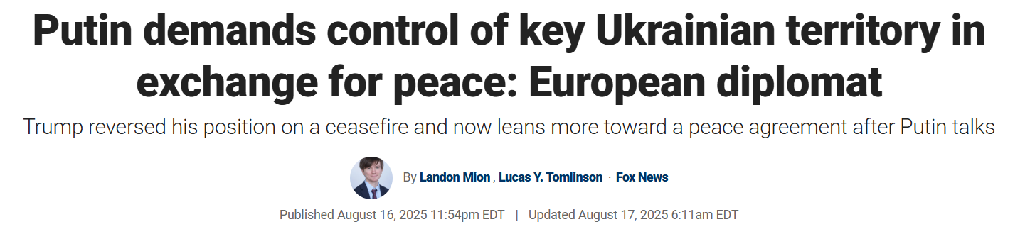 "После встречи с Путиным в пятницу на Аляске Трамп сообщил европейским союзникам, что российский президент вновь заявил о своей заинтересованности в ключевых Луганской и Донецкой областях, но при этом он, по всей видимости, открыт для возможности урегулирования тупиковой ситуации в Запорожье и Херсоне, а также замораживания напряженности вдоль линий фронта", - пишет издание.
