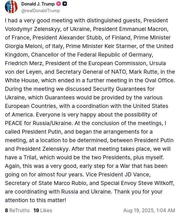 "Во время встречи мы обсудили гарантии безопасности для Украины, которые будут предоставлены различными европейскими странами в координации с Соединёнными Штатами Америки. Все очень довольны возможностью достижения мира между Россией и Украиной. По завершении встречи я позвонил президенту Путину и начал организацию встречи, место проведения которой ещё предстоит определить, между Путиным и Зеленским. После этой встречи состоится трёхсторонний формат - два президента и я. Ещё раз отмечу, что это был очень хороший шаг на пути к завершению войны, которая продолжается уже почти четыре года", - написал Трамп.
