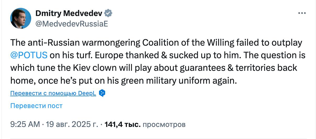 "Антироссийская воинственная "Коалиция желающих" не смогла переиграть президента США на его поле. Европа поблагодарила его и прогнулась. Вопрос в том, какую песню будет петь киевский клоун о гарантиях и территориях у себя дома, когда снова наденет свою зелёную военную форму", - написал на английском языке замглавы Совбеза РФ, отметив в публикации Трампа.