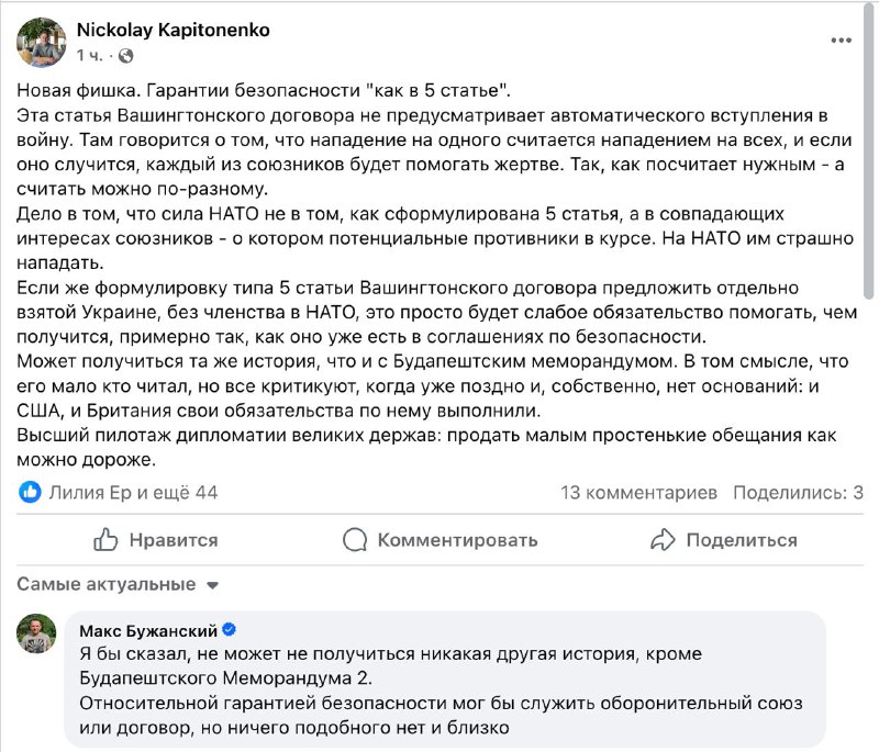 "Эта статья Вашингтонского договора не предусматривает автоматического вступления в войну. Там говорится о том, что нападение на одного считается нападением на всех, и если оно случится, каждый из союзников будет помогать жертве. Так, как посчитает нужным - а считать можно по-разному. Сила НАТО - в совпадающих интересах союзников. Если формулировку типа 5-й статьи предложить отдельно взятой Украине, без членства в НАТО, это просто будет слабое обязательство помогать, чем получится, примерно так, как оно уже есть в соглашениях о безопасности. Может получиться та же история, что и с Будапештским меморандумом", - пишет Капитоненко.