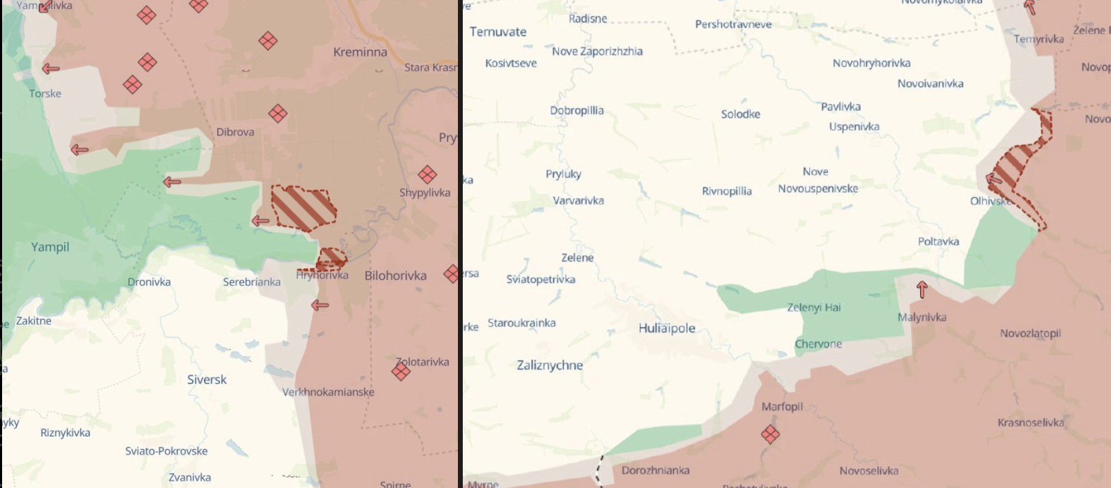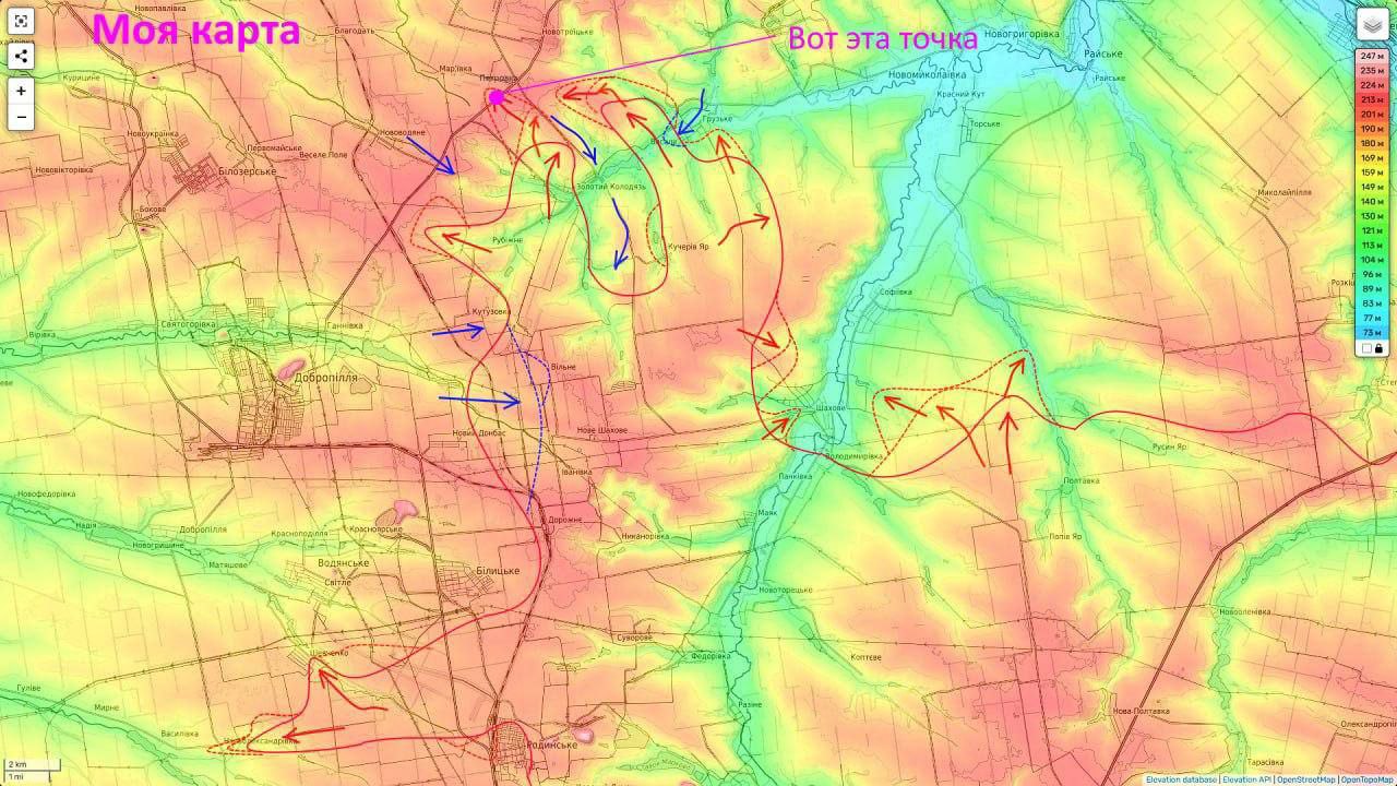 Российские военные паблики также пишут, что в боях восточнее Доброполья инициативу пока не смогла перехватить ни одна из сторон. По их картам, россияне удерживают значительные территории к востоку от Доброполья.