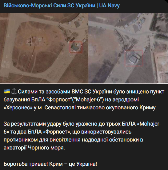 "Силами и средствами ВМС ВС Украины был уничтожен пункт базирования БПЛА "Форпост" ("Mohajer-6") на аэродроме "Херсонес" в г. Севастополе временно оккупированного Крыма", - говорится в сообщении.