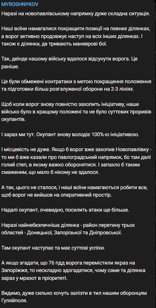 "Сейчас самый опасный участок - район пересечения трёх областей: Донецкой, Запорожской и Днепропетровской. Там противник наступает и имеет существенные успехи. А если вспомнить, что 76-ю воздушно-десантную дивизию противника перебросили как раз на Запорожье, то несложно догадаться, почему именно этот участок сейчас в приоритете у РФ. Очевидно, они очень хотят прорваться в тыл нашим защитникам Гуляйполя", - написал обозреватель.