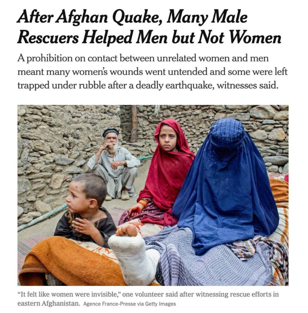 "Первые спасатели прибыли в деревню Биби Айши спустя более 36 часов после того, как в воскресенье землетрясение разрушило поселения в горных районах восточного Афганистана. Но вместо того, чтобы принести облегчение, их вид усилил её страх: среди них не было ни одной женщины" - пишет издание.