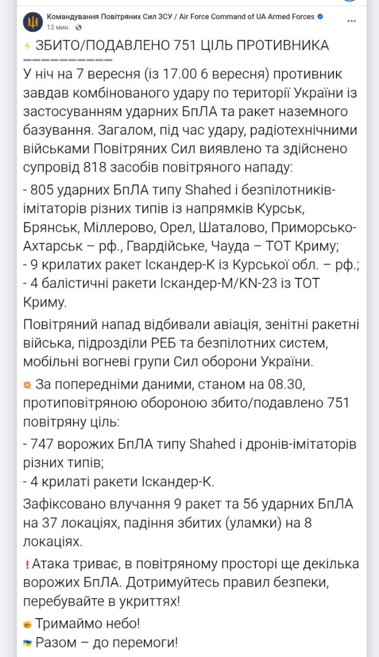 Украину ночью атаковали 805 "Шахедов" и дронов-имитаторов (сбито/подавлено 747). Также было запущено 13 ракет: 9 крылатых "Искандер-К" (сбито 4) и 4 баллистические "Искандер-М/KN-23" (все достигли целей).