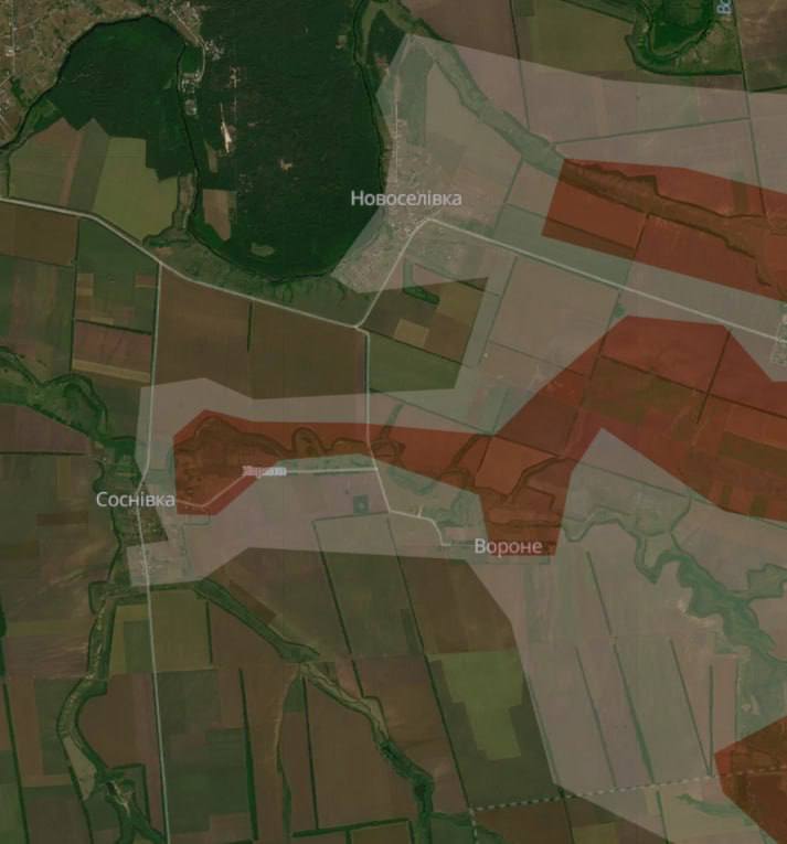 Этот населенный пункт находится между Сосновкой и Вороным. О продвижении на этом направлении россиян сегодня сообщал украинский военный телеграм-канал Deep State. На его карте село находится частично в серой зоне, частично - под контролем РФ.