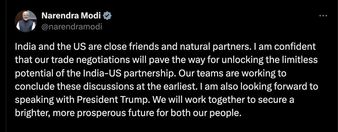 Моди ответил главе Белого дома в соцсети Х, что "наши команды работают над скорейшим завершением этих переговоров. Я также с нетерпением жду встречи с президентом Трампом".