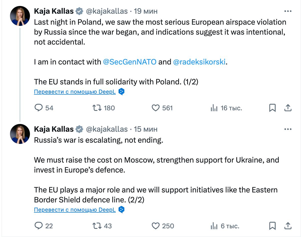 "Вчера вечером в Польше мы стали свидетелями самого серьёзного нарушения Россией европейского воздушного пространства с начала войны, и есть основания полагать, что это было преднамеренное, а не случайное нарушение. Война России обостряется, а не заканчивается. Мы должны увеличить цену для Москвы, усилить поддержку Украины и инвестировать в оборону Европы", - сказано в публикации Каллас.