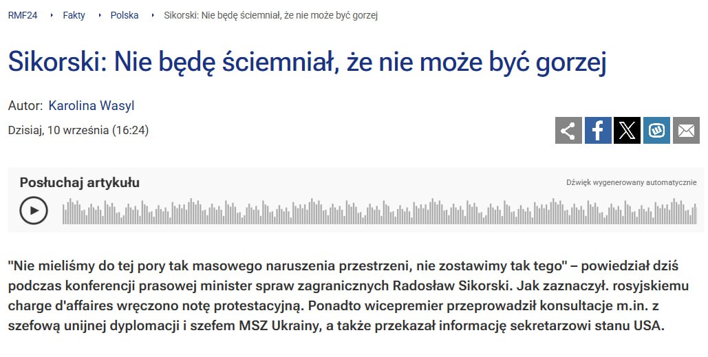 Тем временем глава Минобороны Польши Владислав Косиняк-Камыш сообщил, что Швеция срочно направляет в Польшу дополнительные самолеты и средства ПВО.