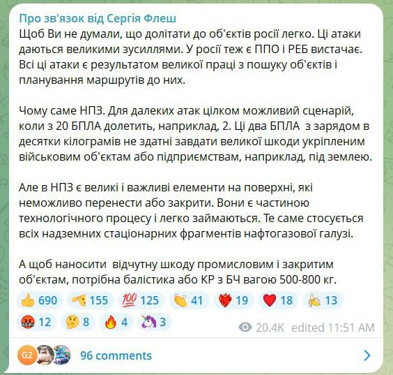 "Эти два БПЛА с зарядом в десятки кило не могут нанести серьёзный ущерб укрепленным военным объектам или предприятиям, например, под землей. Но у НПЗ есть большие и важные элементы на поверхности, которые невозможно перенести или закрыть. Они являются частью технологического процесса и легко поджигаются. То же касается всех надземных стационарных фрагментов нефтегазовой отрасли. А чтобы наносить ощутимый вред промышленным и закрытым объектам, нужна баллистика или крылатые ракеты с боезапасом весом 500-800 кило", - пишет эксперт.