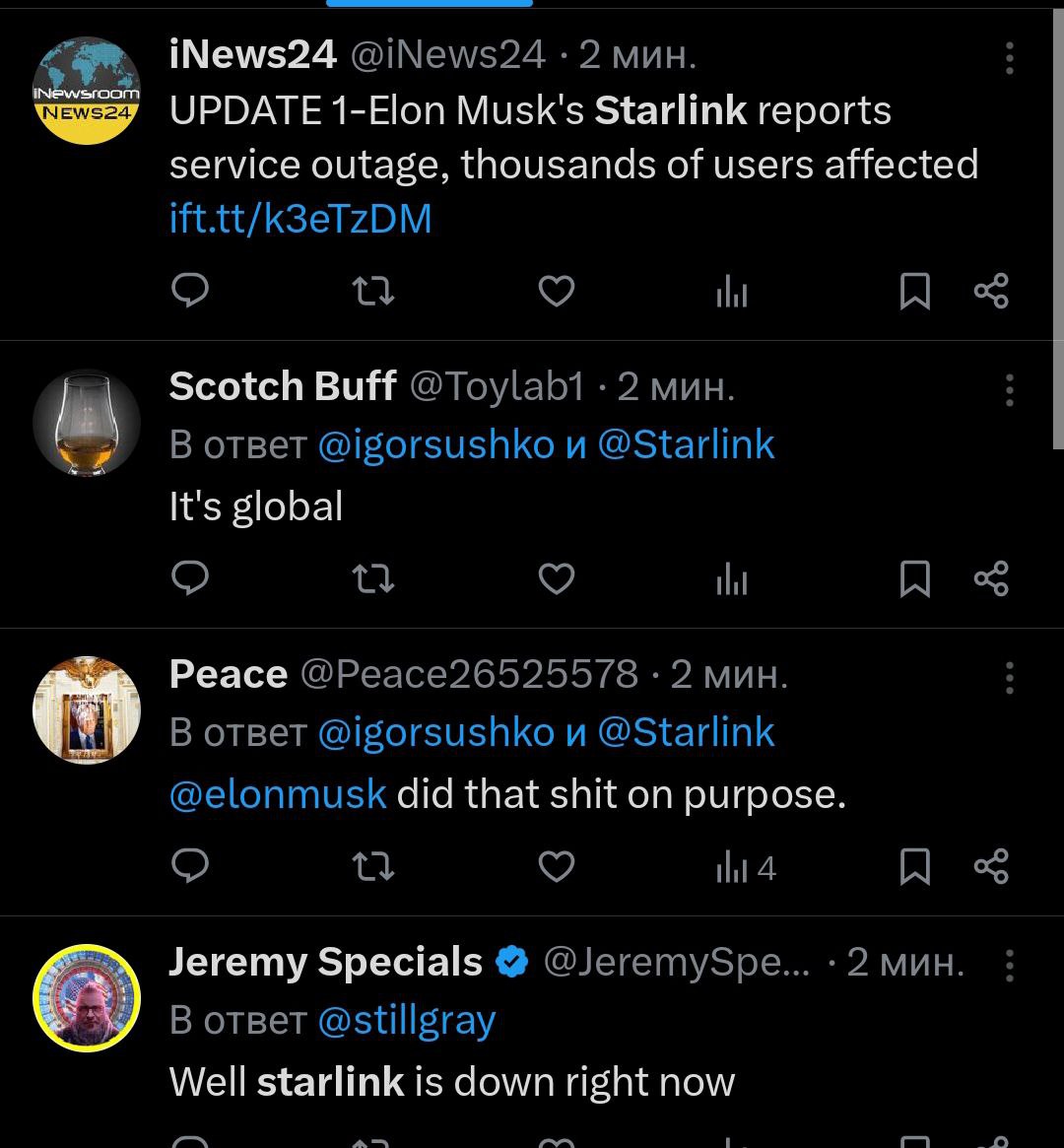 8.08 По всему фронту не работает спутниковая связь Starlink, сообщил командующий Силами беспилотных систем Роберт Бровди.