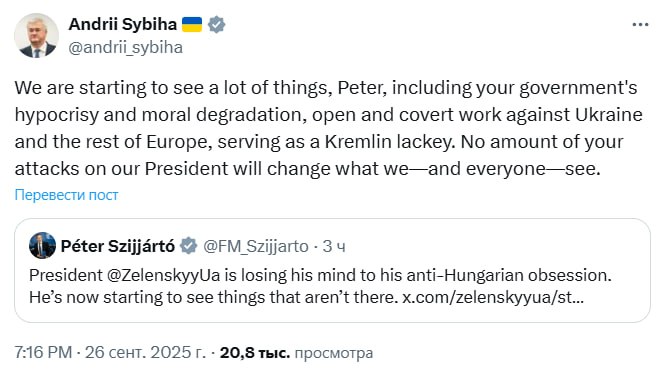 "Мы начинаем видеть многое, Петер, включая лицемерие и моральное падение вашего правительства, его открытую и скрытую работу против Украины и всей Европы, его подхалимство перед Кремлём. Никакие ваши нападки на нашего президента не изменят того, что видим мы – и все остальные", – написал глава МИД Украины.