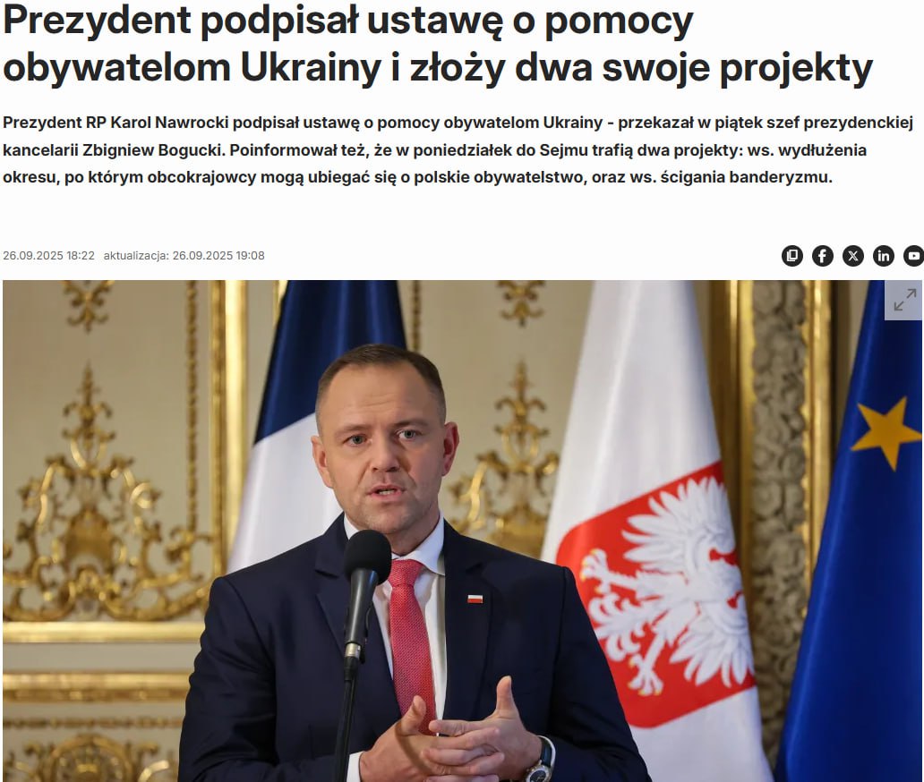 В свою очередь глава канцелярии президента Польши Збигнев Богуцкий заявил, что Навроцкий в последний раз подписал закон о специальной помощи для украинцев.