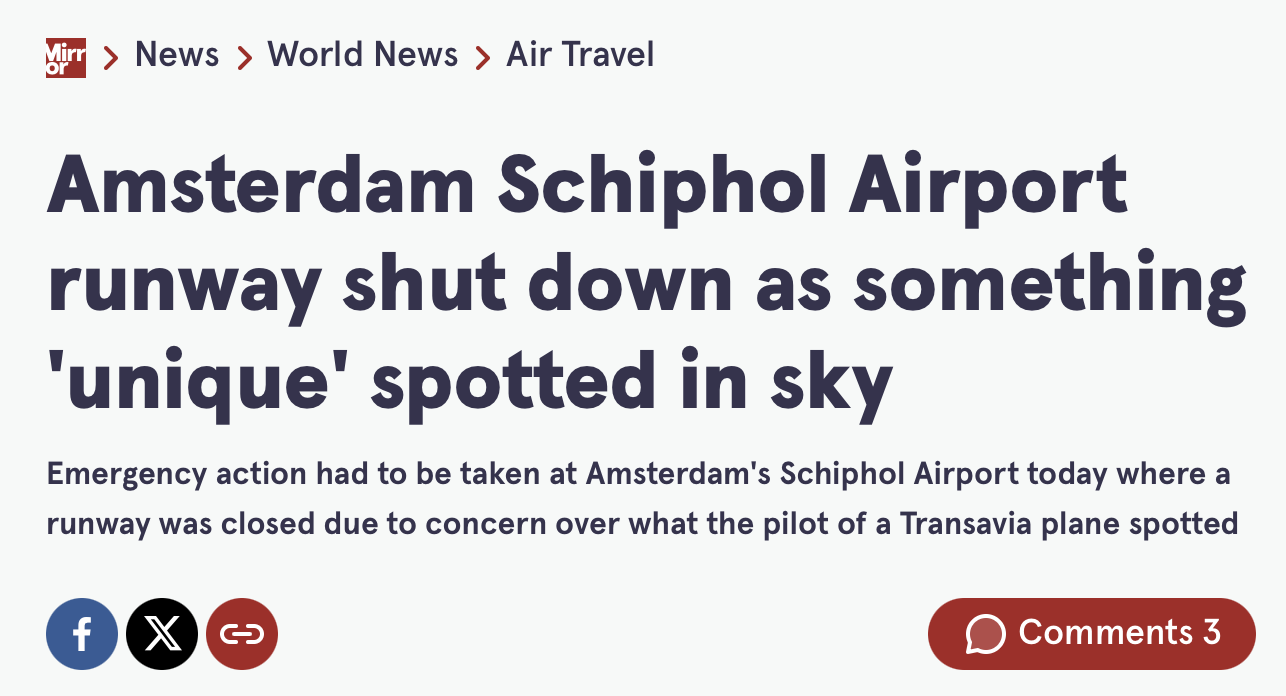 В столице Нидерландов Амстердаме взлетно-посадочную полосу в аэропорту Схипхол закрыли из-за появления неизвестного дрона. Беспилотник был замечен на высоте около 150 метров.