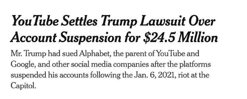 Видеохостинг YouTube согласился выплатить 24,5 миллиона долларов в рамках урегулирования судебного иска президента США Дональда Трампа о блокировке его аккаунта в 2021 году после беспорядков в Капитолии 6 января 2021 года. Из этой суммы 22 миллиона получит организация Trust for the National Mall, отвечающая за обустройство бального зала в Белом доме, а оставшиеся 2,5 миллиона - другие истцы по делу, включая писательницу Наоми Вульф и Американский консервативный союз.