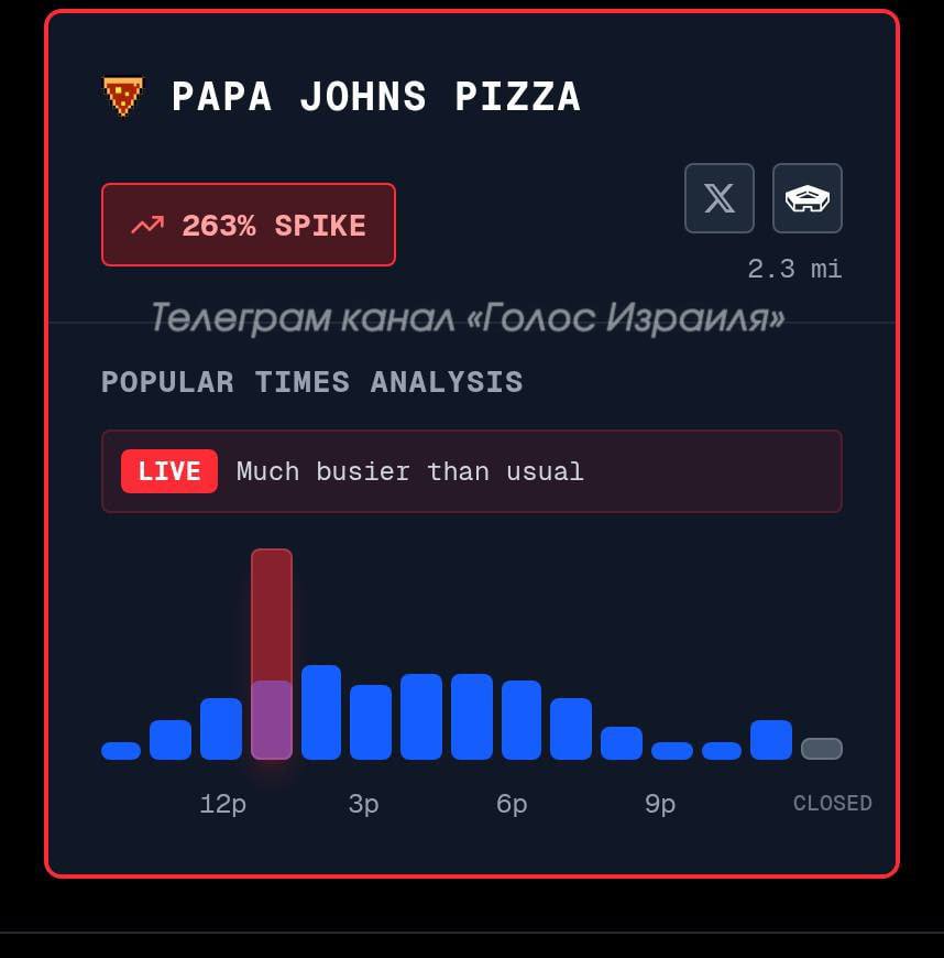 Об этом пишут израильские паблики со ссылкой на рост "индекса пиццы Пентагона" – неофициального индикатора военной активности Министерства войны США.