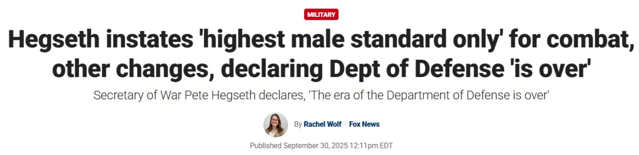 Напомним, сегодня в Пентагоне состоялось масштабное собрание американских высших офицеров, которых министр войны США Пит Хегсет созвал со всего мира. В частности, во время выступления Хегсет заявил, что в Пентагоне больше не будет "никаких парней в платьях". По словам министра, в армии США больше не будет не только трансгендеров, но также полных, бородатых и длинноволосых военных.
