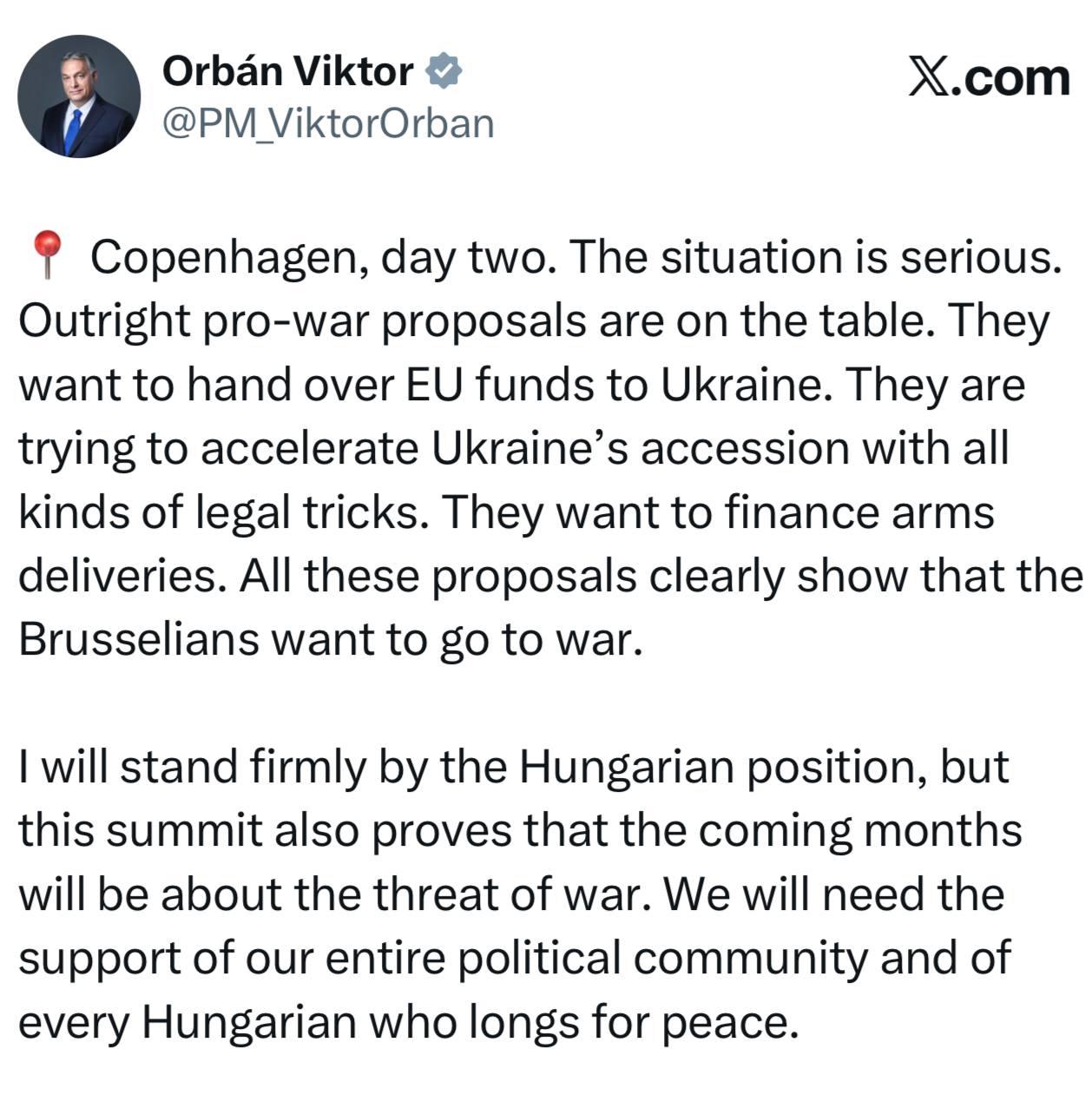 "Ситуация серьёзная. На столе переговоров находятся откровенно провоенные предложения. Они хотят передать Украине фонды ЕС. Они пытаются ускорить вступление Украины, используя всевозможные юридические ухищрения. Они хотят финансировать поставки оружия. Все эти предложения ясно показывают, что брюссельцы хотят начать войну. Этот саммит доказывает, что ближайшие месяцы будут связаны с угрозой войны", - написал Орбан.