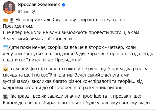 Железняк считает, что решение провести встречу является реакцией на критику в прессе, в том числе западной, в адрес президента: СМИ утверждают, что Зеленский не слушает свою фракцию и концентрирует власть в руках ограниченного числа чиновников Офиса президента. А также на то, что на предыдущую встречу пришла только половина фракции, чем был недоволен Зеленский.