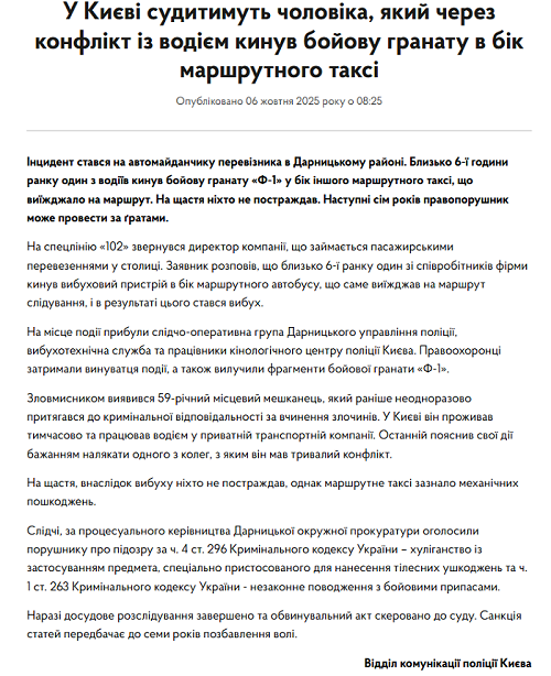 В Киеве будут судить мужчину, который во время конфликта с коллегой бросил боевую гранату в сторону маршрутного такси. Инцидент произошёл на территории автопарка перевозчика в Дарницком районе столицы. К счастью, никто не пострадал, но автобус получил механические повреждения.