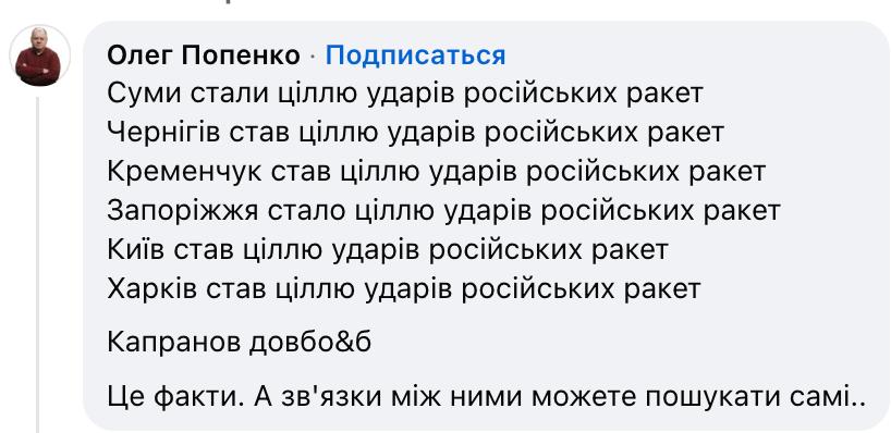 "Сумы стали целью ударов российских ракет. Чернигов стал целью ударов российских ракет. Кременчуг стал целью ударов российских ракет. Запорожье стало целью ударов российских ракет. Киев стал целью ударов российских ракет. Харьков стал целью ударов российских ракет. Капранов долбо@б. Это факты. А связи между ними можете поискать сами", - передразнил умозаключения писателя эксперт по ЖКХ и энергетике Олег Попенко.