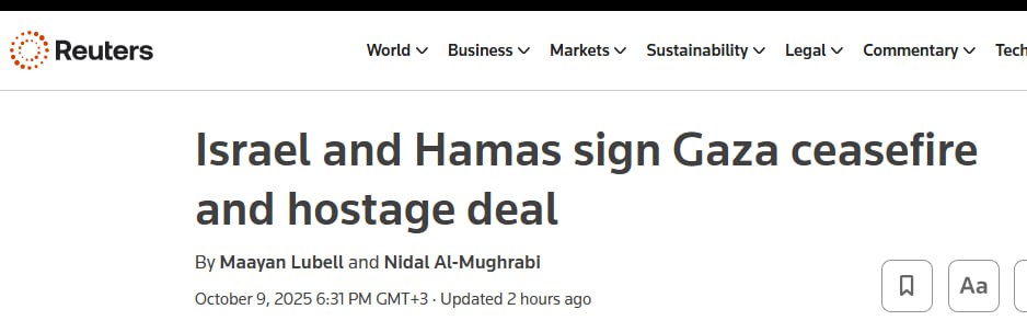 В свою очередь о том, что Израиль и ХАМАС подписали соглашение о прекращении огня и освобождении заложников в секторе Газа, сообщает агентство Reuters.