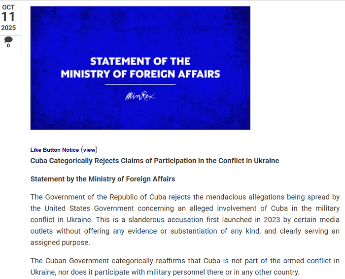 Напомним, тему об участии кубинских военных в войне в Украине на стороне РФ в последнее время активно продвигают американские дипломаты, используя это как аргумент для убеждения европейцев не голосовать за резолюцию ООН с призывом к США снять блокаду с Кубы.