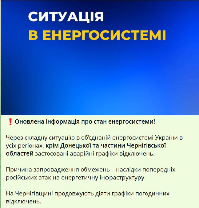 18.22 Экстренные отключения света действуют по всей стране, кроме Донецкой и Черниговской областей, сообщает Минэнерго.