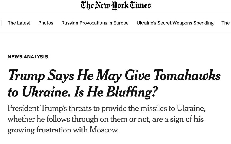 На днях заместитель председателя Совета безопасности РФ Дмитрий Медведев предупреждал, что поставки "Томагавков" Украине "плохо закончатся для всех и прежде всего - для самого президента США Дональда Трампа".
