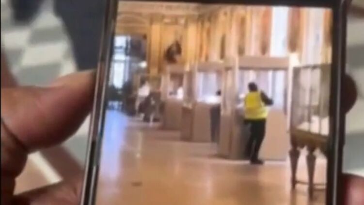 На кадрах мужчина в жёлтой жилетке работника музея взламывает витрину в галерее Аполлона. В это время вокруг спокойно ходят посетители, не обращая внимания на происходящее.
