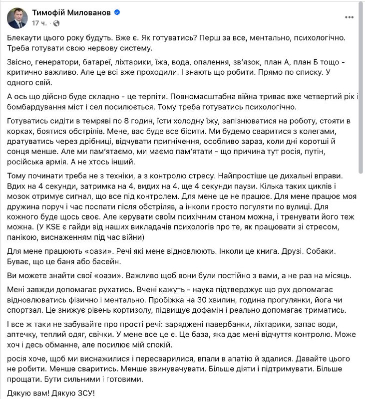 "Блэкауты в этом году будут. Уже есть. Как готовиться? Прежде всего ментально, психологически. Нужно готовить свою нервную систему. Конечно, генераторы, батареи, фонарики, еда, вода, отопление, связь, план А, план Б и т.д. - критически важно. Но это все уже проходили. И знают, что делать... Поэтому начинать нужно не с техники, а с контроля стресса. Проще всего это дыхательные упражнения. Вдох на 4 секунды, задержка на 4, выдох на 4, еще 4 секунды паузы. Несколько таких циклов - и мозг получает сигнал, что все под контролем", - написал экс-министр.