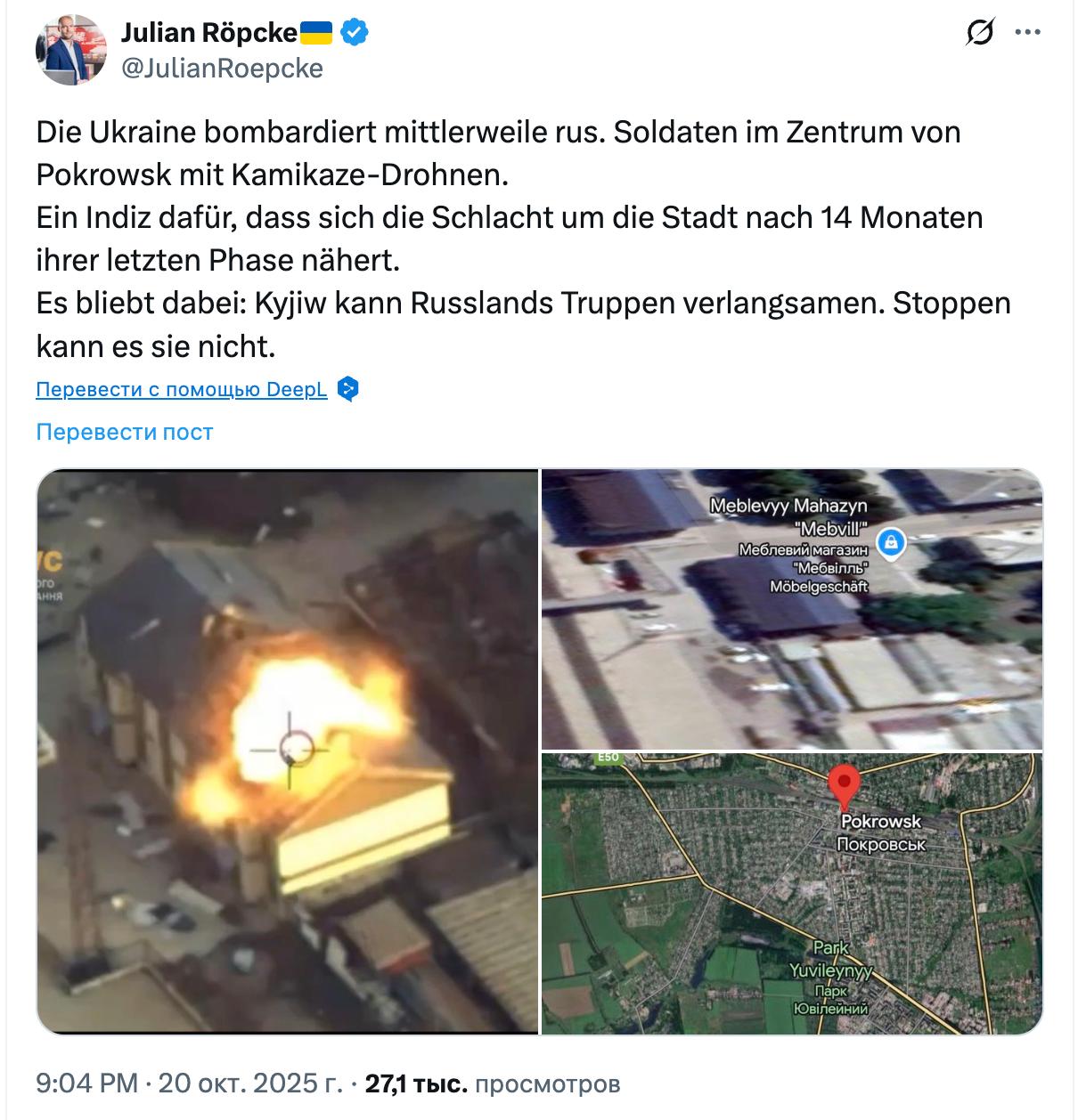 "Украина в настоящее время бомбардирует российских солдат в центре Покровска с помощью дронов-камикадзе. Это свидетельствует о том, что после 14 месяцев сражение за город приближается к своей последней фазе. Остается неизменным одно: Киев может замедлить продвижение российских войск, но остановить их не может", - пишет Репке.