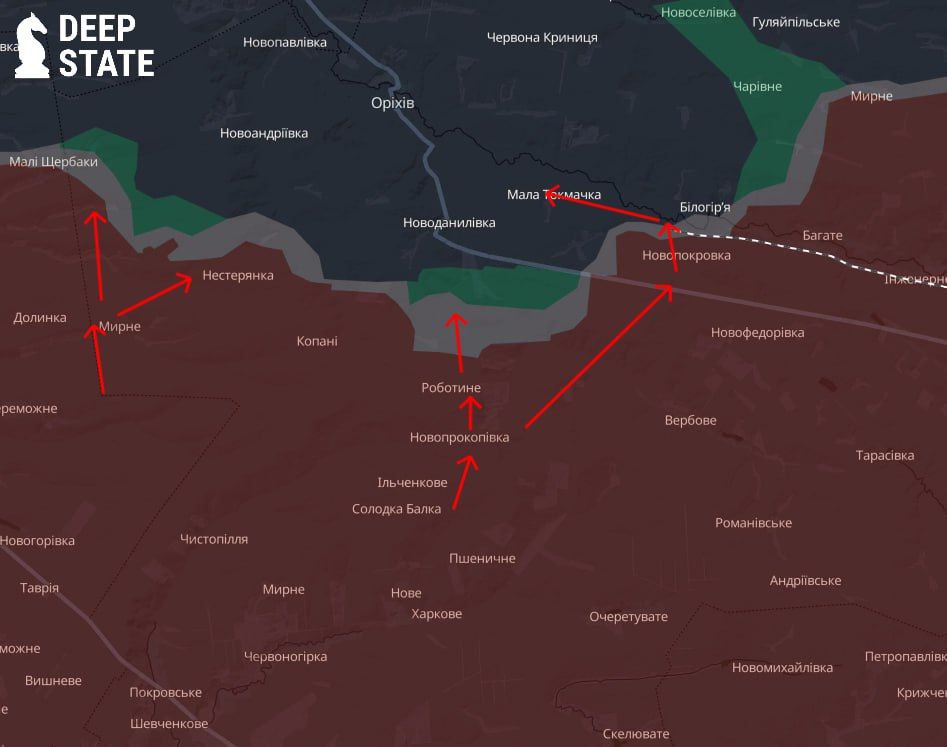 Deep State пишет, что атака произошла по линии от Нестерянки до Малой Токмачки (на карте). Россияне пошли на штурм, используя бронетехнику и мотоциклы, высадив пехоту, которая вошла в Малую Токмачку и остаётся там до сих пор.