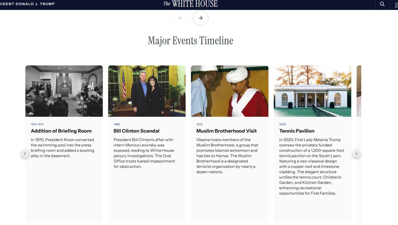 Новая хронология появилась на сайте на фоне упрёков со стороны членов Демократической партии в адрес Трампа из-за процесса строительства бального зала в Белом доме, включая обвинения в коррупции, а также нанесении ущерба облику всего ансамбля президентской резиденции.