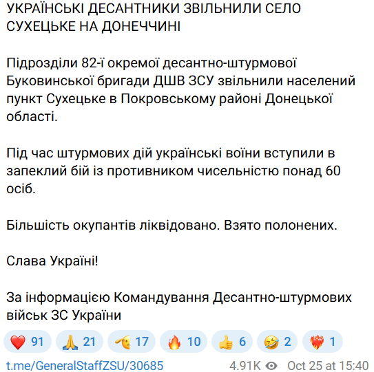Подразделения 82-й отдельной десантно-штурмовой Буковинской бригады ДШВ ВСУ освободили населённый пункт Сухецкое в Покровском районе Донецкой области.