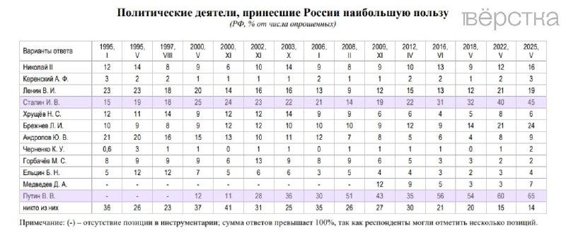 На фоне роста популярности Путина и Сталина увеличилась и доля тех, кто положительно оценивает роль Николая II (16%) и Леонида Брежнева (24%).
