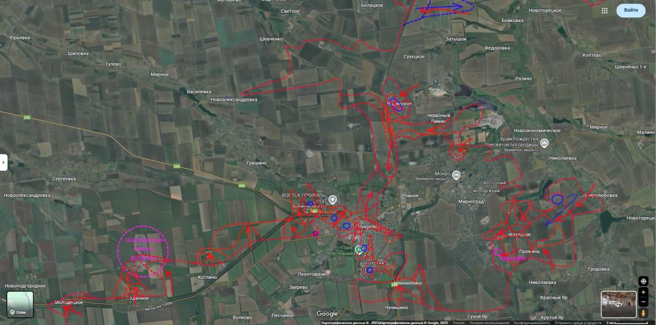 Причем "клешни" к северо-западу от Покровска подходят вплотную к ключевой дороге, по которой снабжается и Покровск, и Мирноград. Некоторые российские паблики писали, что буквально в течение суток эта дорога была уже перекрыта.