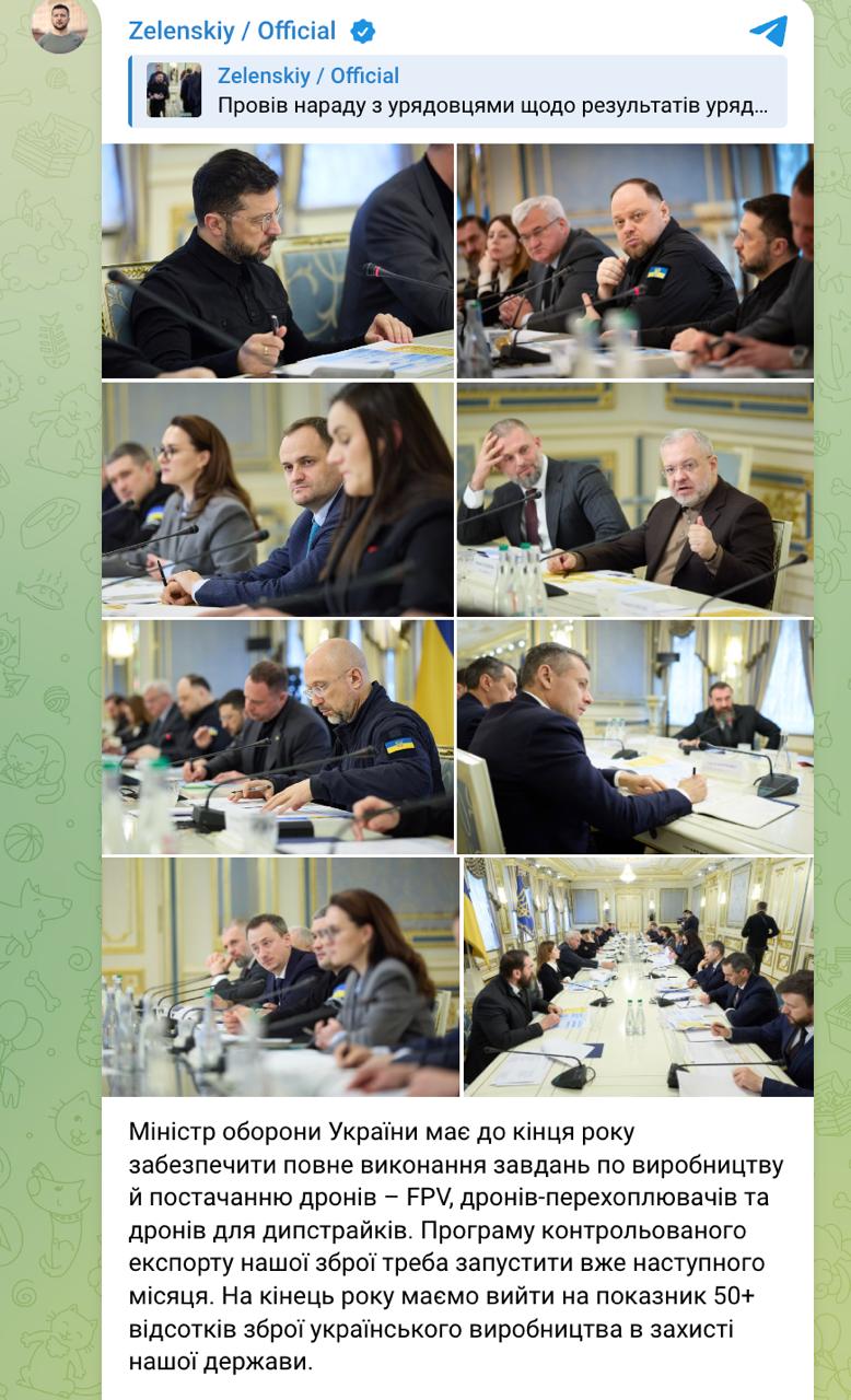 "Министр обороны Украины должен до конца года обеспечить полное выполнение задач по производству и поставке дронов – FPV, дронов-перехватчиков и дронов для дипстрайков. Программу контролируемого экспорта нашего оружия нужно запустить уже в следующем месяце. К концу года должны выйти на показатель 50+ процентов оружия украинского производства в защите нашего государства", - написал Зеленский.