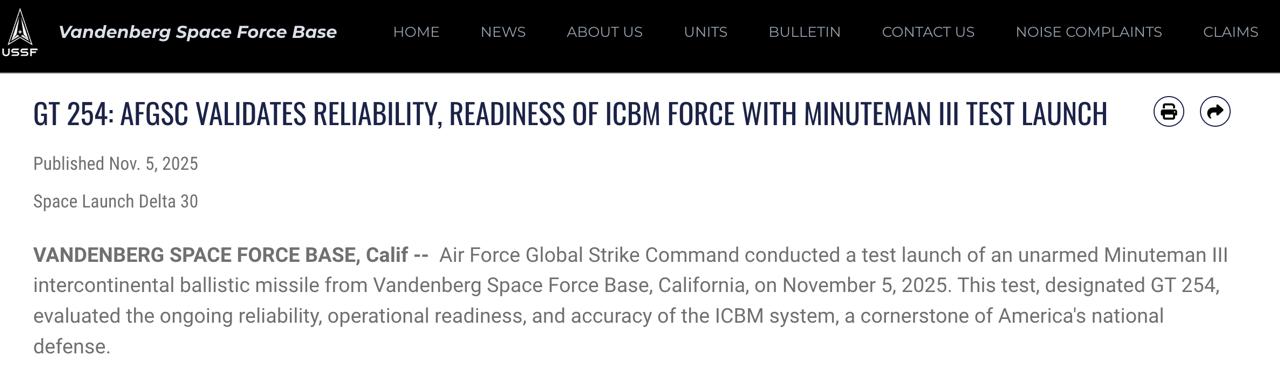 Несмотря на регулярность подобных мероприятий, нынешний запуск приковал к себе повышенное внимание, так как состоялся вскоре после директивы Дональда Трампа о возобновлении некоторых видов ядерных испытаний.